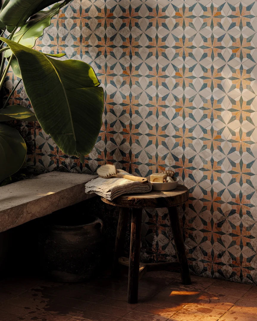 Design the most authentic large diamond-patterned bathroom floor, shower wall, or kitchen backsplash with our Handmade Hexagon Limestone Mosaic Tile in Sunset Orange (also considered Terracotta color), Teal Blue, and Shadow White colorways.