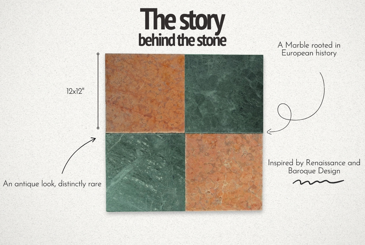 This set unites two of nature's most iconic marbles: the lush, forest-deep green marble of our Foresta Italiana Antique Marble Tile and the fiery, sun-warmed red marble of our Rosso Storico Antique Marble Tile. Together, they form a green and red checkered tile pairing that feels simultaneously ancient and boldly contemporary.