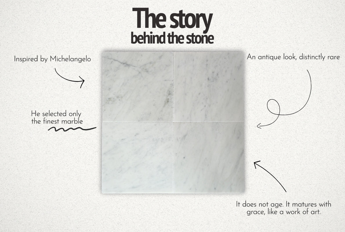 Shop the finest white marble tiles. Bianco di Michelangelo white marble tile brings museum-worthy beauty and timeless luxury to modern interiors. We are inspired by the way Michelangelo saw marble. Not just as a material, but as perfection hidden in stone. He believed every block already carried its own beauty within, waiting to be revealed. That same spirit guides us today. We select only the finest marble, just as he did, to create timeless pieces for interiors that feel both elevated and enduring.